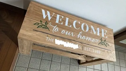 世界に1つだけの名前入りベンチ 「玄関先でブーツの着脱に腰掛けたいな」とベンチを作りました。ファミリーネームと結婚した年をステンシルで描いています。ワークショップの現場では「すゆさん」がお隣で作っていらっしゃいましたが、メンバー5人がそれぞれ個性的な絵柄で楽しく制作しました。@幕張店