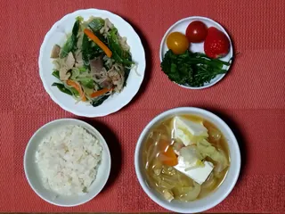 今日の夕食 お友達からお裾分け頂いた葉玉ねぎを使い野菜炒め物作りました😊葉玉ねぎ、豚肉、人参、キャベツ、しらたきで味噌、オイスターソース、みりん、塩胡椒、にんにく醤油で味付けしました😉キャベツ、玉ねぎ、人参、もやし、油揚げ、豆腐のお味噌汁と押し麦入りご飯とブロッコリー、ミニトマト、いちごで食べました😋💕🎵とても