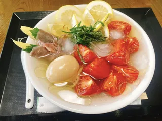 冷やしレモントマトラーメン 暑くなってきたから冷やしラーメン‼️麺は細麺が良かったのですが在庫の細麺は加水30%🤨冷やしには多加水麺の方が合うから在庫の春よ恋の中太麺加水40%を採用清湯スープにトッピングは果肉も真っ赤なトマト、無農薬レモン、ランキングエッグの味玉、家の庭になっている青しそ、ヤングコーンに生ハムのしそ巻き、香味