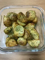 新じゃがで、 カレー風味にしてみました。緑のは、パセリではなく、手作りのにんじんの葉っぱでーす。