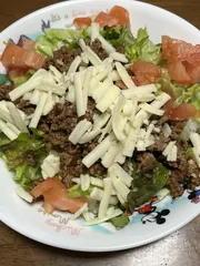 野菜とチーズをたっぷりトッピングして、タコライスを作りました。ひき肉とトマト、レタス、チーズが合わさってとても美味しかったです。