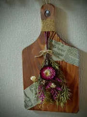 先日のDAISOパトロールで買ってきた物でほぼ作った壁掛けです♥ 簡単ですぐ出来ちゃうのでやってみたい人はどうぞ♥ 材料費400円程度? 材料(ほぼ全てダイソー)カッティングボードお好みのドライフラワー(ブーケになってるもの)麻ひも水性ニス(ウォルナット)細いワイヤー(