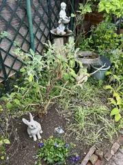 大きく剪定したオリエンタルセージ 剪定する前の姿です。花後は、一部ドライフラワーにしてますが、大きくなり過ぎて、薔薇のロココや、下に一面に咲こうとしている、可愛い🩷球根の花が押しつぶされてます。思い切った覚悟で、剪定した姿が上の写真ですね。女の子の像も、鳥の水飲み場もちゃんと見えて来たし、したで生きてる球根にも日が当たってます。その