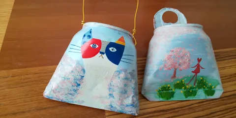 またまたおじゃましまーす。😁 1個、失敗したけど、二つできました。✌️ リメ缶バックです。😁 猫のはそのまま生かす感じで、もう1個は色塗りします。😆 アルミ缶、ハサミ使ってチョキチョキ、簡単に切れる。😆🎶 手はケガしないようきをつけてやりました。😆🎶 以前のシダーローズさんの投稿みて、金物が切れるハ