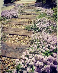 枕木の小道 玄関脇に憧れてた小道を作りました。 植えたタイムも広がり満開の時季はお花畑みたいで気に入ってます♪
