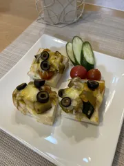 ラタトゥイユでピザ風トースト 昨日は冷蔵庫の残りもので、らんらん夏のパン祭り🍞🥖を開催しました。画像は、食パンに残りもののラタトゥイユとチーズを乗せて焼いたものです。 一緒に作ったオープンサンド。オープンサンドのレシピはこちら💁https://diy-square.cainz.com/announcements/zz9