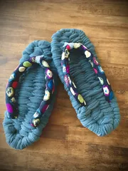 布草履 Mサイズ よれよれのフリースの上着から、Mサイズの草履作りました🎶新年初のDIY、楽しかったです❗️ 布の切れ端から糸屑がいっぱい落ちるので、最後の掃除が大変でした💦 フリース素材は厚みがあるので割とすぐに土台ができ、足のサイズに合わせて鼻緒を調節したので、歩く時パタパタしません。&nbs