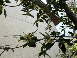 ローリエ 50センチほどの苗木を数年前に植えたら家屋を超えましが、お花は小さくイエローで可愛いです。
