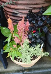 夏の寄せ植え ケイトウとブラックパールとセダムのフクリンマンネングサの寄せ植えを作りました。たぶんセダムと普通の草花を一緒に寄せ植えしたら水やりのタイミングが合わないので難しい気がしましたが、この組み合わせ色合わせが可愛いので寄せてしまいました。今のところ元気です😆