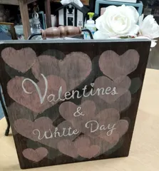 少し早いですが2月🩷・3月🤍に飾れます✌️ハート🩷いっぱい…プレートはファイルのハート型切り抜きのステンシル仕上げ❣️ロゴ文字はこちらを参考に板の大きさバランス考えて書いてみました✌️