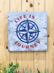 ミニサインボード 前回のミニサインボードにハマって今回は新しいデザインで‼️ "人生は旅" その言葉とデザインから海の青と太陽の赤そして航海で星を目印にしていた話から黄色を使ってみました😊 青も外枠と内枠で色を変えてみましたが分かりずらいかな⁉️😅 ステンシル楽しい🥰