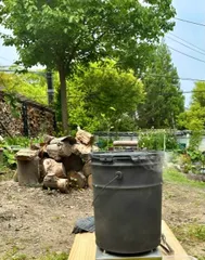 朝の家事を済ませた 9:30、いよいよ初めての燻製にチャレンジです。どれくらい煙が出るのか分からないのでとりあえずは庭で。と、その前に温度計を差し込む穴を開けましたペール缶のポンプ差し込み口がいい仕事してくれてます。デッキでしようかと思ったんですけど洗濯物がスモークされそうなので急遽コンテナボックス