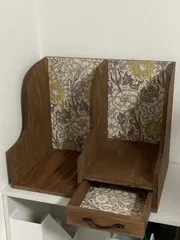 レトロなブックスタンド 先日のワークショップから、残りの壁紙で引き出しの中を貼りました。白ベースの壁紙は、柄が大きいのか柄合わせが出来なかったです。でも、バランス良く貼れました。部屋の雰囲気にもあって、作って良かったです。