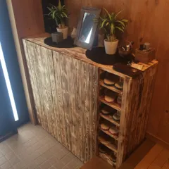 ジャストサイズで好みのデザインの下駄箱・・・ありませんでしたなので作ってみました 今は玄関にもクローゼットを付けるというのが流行りですがこの家にはそんな物はありませんなので見えてしまう下駄箱はお客様を迎える上でも重要と思ってます 材料はSPF材来客6人設定の家なのでスリッパ収納は