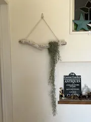流木はうっすら白でペイント、白いロープで合わせました。フックは目立ちすぎたので、釘にしています。ドライフラワーや、グリーンを掛けて玄関のアクセントにしています。