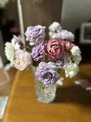 庭のバラをカット 昨日の雨で軒下に避難したバラ🌹少し花びらが傷んでたのでそろそろ終わりそかなと😆カットしました💕紫系が3種類あって自分で😵しました💘いい香りです🤭
