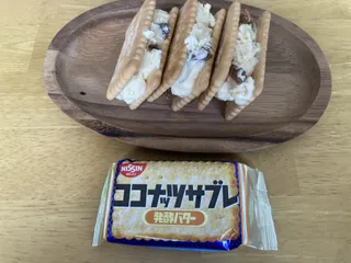 バニラアイスに混ぜてラムレーズンアイスにしたものをココナッツサブレでサンドしてみました。今どきのココナッツサブレは発酵バター味もあって相性バッチリでした👌