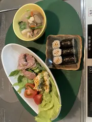 寒くなって来たのでトン汁にかぼちゃサラダと胡椒豚のサラダ ■材料豚汁豚肉,大根,人参,ごぼう,里芋,こんにゃく,油揚げ,木綿豆腐,小松菜出汁、味噌 ■作り方豚肉,人参,里芋,ごぼう,大根、こんにゃくを炒めます。だし汁で,煮立ったら,垢取りして油揚げ,木綿豆腐,入れて火が通ったらみそと小松菜入れてできあがりです。■工夫ポイント味噌入れたらあまり煮立