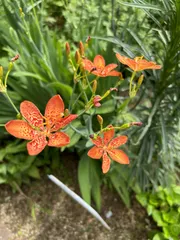 桧扇ひおうぎが咲きました。 京都は祇園祭の真っ最中、‼️汗だくの夏、祇園祭が始まる頃に咲くお花。葉っぱが祇園祭りに使う、うちわの姿にそっくりなので、この名前がついたと聞いてますけっこう次々と花をさかせてくれますね。