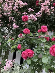 玄関のバラ 玄関のバラです🌹群舞とレオナルドダビンチ。家族には不評です😅出入りする時に、邪魔っ、蜂が🐝来る、だそうです😑冬に時間かけて、春はどう咲くか妄想しながら剪定、誘因してるのに。この枝がここに来て、多分こう咲くから、ん〜違うなぁなどぶつぶつ呟きながら😅通り掛かりの人が見たら完全に怪しい人ですっ🤣今年もこの