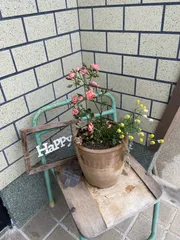 4月に買ったミニバラ🌹のカブ分けをするために植木鉢にバラ、カモミール、多肉を寄せ植えしました😆👍✨セリアのネット板にHappyのオブジェを付けた物と転写シールしたサビサビスコップを古道具屋さんで買った幼稚園の椅子に置いて玄関先をかわいくデコしています。🎶 外だから椅子の鉄部分も自然サビが出てきていい
