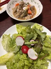 野菜のオカズ 久々のモリモリ生野菜サラダ🥗サニーレタス、春菊、二十日大根 向こうにあるのは今年2回目のモツ煮。今回はもっと美味しくできました😁モツを茹でこぼすこと3、4回。圧力鍋で30分を2回位。その後野菜とこんにゃくを入れて味付け。結構手間がかかりますね。