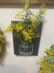 黒いボードのストリングアート、作品が映えますね♪ ミモザのリースも沢山❣️ 香りに包まれて💕 だけどこんなに作るのは結構大変ですよね。 もらった方は嬉しいですもん、その笑顔のために、ですね😊