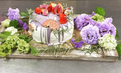 手作りケーキ 久しぶりにシフォンケーキを焼きました。職場の方が古希を迎えられたので お祝いのケーキです。紫の色はブルーベリーと生クリームを混ぜて作りました。トルコ桔梗に助けてもらってます。