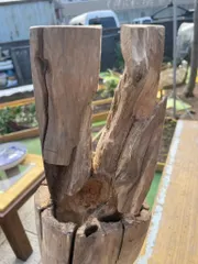 逆さにしてます。2月2日投稿(リンク→ https://diy-square.cainz.com/announcements/yaaholvbcr8ccn5j )の小鉢ツリーメンテナンス思案のその後の続きです。少しでも多く腐敗を除去する作業です。手鋸、ボアビット掘削、棒ヤスリ、サンダー、彫刻刀、、彫