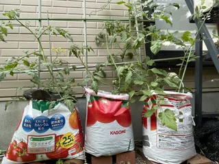 トマトづくりにチャレンジ ■ミニトマト■庭が狭いので、本当にこんなやり方で育つのか?と、思いましたが、スクスク成長しています。収穫期がとても楽しみです。
