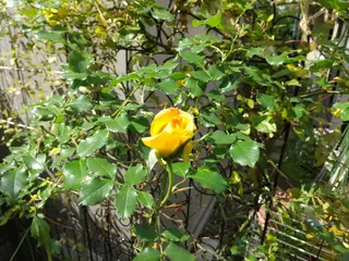 つるバラのサハラ。やっと一輪 咲きました。ちょっと黒星病を発症している葉もあり、あまり元気がありません。蔓を誘引している関係で、雨にあたってしまうのもよくないのかも。エターナルは玄関前の雨のあたらない場所にあるので、とても元気です。