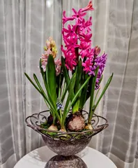 球根を使ったアンティークな寄せ植えのヒヤシンスが咲きました🎵ムスカリも随分大きくなってきてました😊色づく前のこの状態も好きだなぁ😍