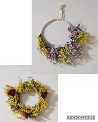 道の駅でミモザを入手したので 小さなリースを2つ作りました💕 右上のリースには かすみ草を 左下にはあざみを 組み合わせてみました😃
