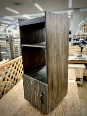 小物収納付きマスクボックス 先日ワークショップへ行くと、なんと参加者は私一人。あっという間に完成に近づき、時計を見ると1時間も経っていない!そこで、「乗っけるフタではなく蝶番付けられますか?」とか、「フタは取っ手付けなくて指がはいるくらいの半円に穴を開けて…」など、私のアレンジ希望を叶えてくれて、見本とは違う印象の、スッキリボ