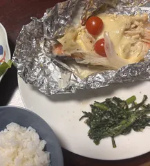 鮭でホイル焼きを❣️具はエノキ、玉ねぎ、モッツァレラチーズ、ミニトマト、マヨネーズ掛けちゃいまた🤭一緒のお皿にのっているのは春菊の胡麻和えです💕