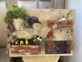 HL.13塗り壁デザインプレート 土曜日のワークショップ参加後…日曜日は、バタバタしていて、今朝早速グリーン入れました!といっても、リースの残り花材や、息子が小さい頃にねだられて買ったサービスエリアのおもちゃ?など、も詰めて絵面的にどうなの?って感じですが、楽しい思い出と、細々花材の収まりどころができた感じです😅