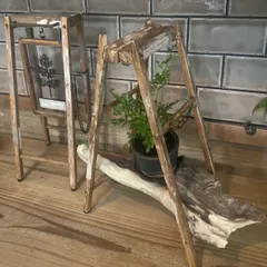 イーゼル2本 ナナメカットの部分をいかして作ったラダーシェルフです。ナナメ部分を下側に半回転させてハシゴを作っています。イーゼルの受けを外した穴を使って丸棒でハシゴを作ります。上段の丸棒は好きな高さでナナメカットに合わせて端材をビスどめし、同じものを2組作って蝶番で留めています2段にしてディスプレイ