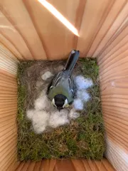 端材で巣箱R6🐦抱卵 4月の巣箱🐦無精卵で寂しかったですが5月にシジュウカラが営巣しました(◍•ᴗ•◍)☝抱卵に費やす時間が多くなってきましたので今度は大丈夫👌と思い投稿します。今ウチのハスキー犬🐕は換毛期で庭でブラッシングします。その毛を🐦上手に使って巣🪺を作っていて🤣面白い🤣徐々に⭕️丸くなっていく様子ご覧ください♪