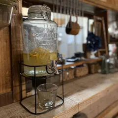 足場板の端材と1×6でDIYしたキッチンカウンターにドリンクサーバー登場。使わない時は棚の中に収まっています。ここが定位置。反対側は焼き網とフレームでショーケース風100均の木箱を並べて(この箱好きだったのに…もう売ってない😢)フレームに蝶番を付けてパタパタ扉にしています今日も暑かったのでレモンシロ