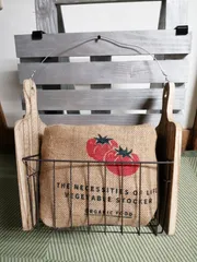またカゴ的な入れ物を。。。 100均のカッティングボード二枚とアイアンのカゴ。ジュートの袋を使いました。 マタ釘で取り付けてあります。 取っ手はワイヤーで。来れも100均。