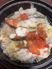 タジン鍋で生鱈とトマトの蒸し焼きです。🐟鱈は塩麹に漬けてあるのでそのまま💕鍋に白菜玉ねぎ定番ですが敷いてあります。野菜に少し塩胡椒を油要らずなので美味しくてヘルシーです😉