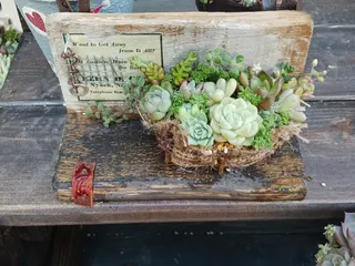 多肉寄せ植え💚グリーンな子たち 以前イベントで購入した作家さんの作品に寄せ植えしました😊今回はこの鉢?作品のイメージに合わせてグリーン💚で🤭寄せ植え前の画像がないですが😅💦この作品木材に釘が打ってあるだけなので、そこに自分で麻を入れ寄せ植え。まあ!安定感ない所への寄せ植えはポロポロ落ちる😱頑張りはここまでが限界😆