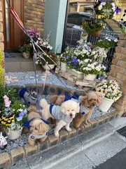 玄関前のお花達、とても素敵ですね。 その中にいる、ワンちゃん達も幸せ😌🌸💓 優しい色合いの花に囲まれて、お散歩から帰って来るのも楽しいでしょうね。m(_ _)m ワンちゃんとお花に、癒されます。m(_ _)m