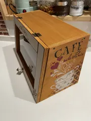 カフェ風ショーケース WSのカフェ風ショーケース2個目作らせて頂きました🎶ひとつは、長女にプレゼント🎁 我が家用は、カウンターの天板に合わせてメープルにしたけど濃さが違う🤣ステンシル柄は、お揃いだけど作ってるうちにどんどんカスタマイズ感が…😅 持ち手は100均のにして内側はカーテン付けちゃったりして😄カーテンはワイヤー張
