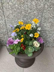 寄せ植えバイキングに行ってきました 寄せ植えバイキングで作ってきました。小さな葉牡丹4苗が1ポットに入っていたので.2苗ずつ分けて植えてみました。今回は色味を揃えたかったのですが、高さのある花の種類が少なく、葉物がなかったのでまたまたカラフルになってしまいました。前回よりは上手く植えることができました。通りががりのお客さんにも「上手だ