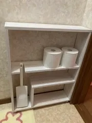 トイレ収納シェルフができました! 家のトイレに置いてみたところ、作るときに思っていた場所ではないところのほうがシックリしてしまいましたが、白のペイントもいい感じです。トイレ洗剤の容器の背が高い物だと下段に置くのはちょっと微妙ではありましたが、制作はとても楽しかったです。また参加したいと思います。