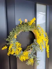 先程、近くのJA販売所にお野菜を買いに行ったら、ミモザを発見😊皆さんの投稿を見てリース作りたいなぁと思っていたので購入しました🌟リースにするには少ない枝ですが、取り敢えず玄関先が明るくなりました💚先の枝を少し切って、水に挿しましたが、どうだろう? 増やせるかな?いや、難しいかな?💦