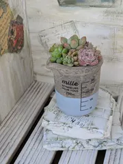 多肉寄せ植え【ビーカー】 ■作品内容ビーカー型の鉢に寄せ植え■工夫ポイント小さな容器なので、可愛い多肉を選びチマチマ寄せ植えしました😊💕