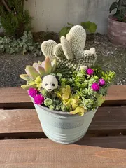 先程投稿したサボテン🌵の寄せ植えがシンプルだったので、次は賑やかにしてみました💖パンダの体が埋もれ、生首っぽくなってしまい、ちょっと怖いかも😰
