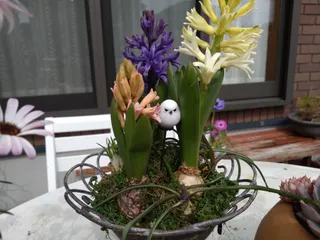 球根を使ったアンティーク寄植え 2週間前に作った球根を使ったアンティーク寄せ植え。ヒヤシンスが咲きました。ヒヤシンスの高さも差がありなかなか良きかな😄ムスカリは花芽がみえてきました。